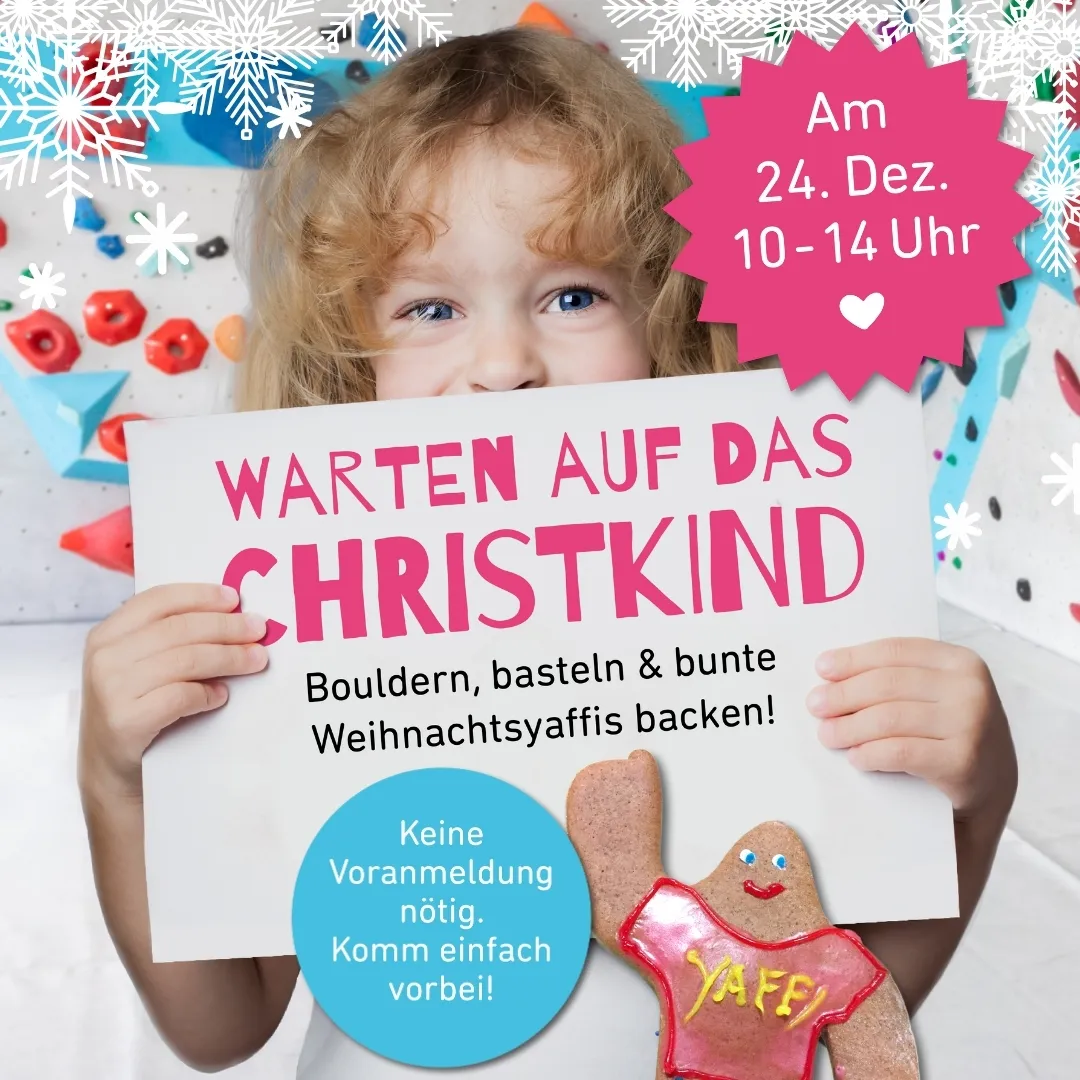 Das Warten auf das Christkind an Heiligabend ist für jede Familie etwas ganz Besonderes. Wir starten in der Boulderwelt Hamburg damit bereits am Vormittag! Bevor das Christkind zu Euch nach Hause kommt und die Bescherung vor der versammelten Familie beginnt, füllen wir für Eure Kinder den Vormittag mit Vorfreude und aufregenden Aktivitäten. Hierfür hat unsere Crew von 10 bis 14 Uhr ein abwechslungsreiches Programm mit Plätzchen backen, Basteln und natürlich Bouldern für die Kids geplant. So verfliegt die Wartezeit aufs Christkind wie im Flug und Ihr erlebt ein harmonisches Fest der Liebe und Besinnlichkeit! Unser „Warten auf das Christkind“-Event ist auch in diesem Jahr wieder ein kostenloses Angebot für Eure Kids. Ihr bezahlt lediglich den normalen Halleneintrittspreis und eine Voranmeldung ist nicht notwendig. Kommt einfach gemeinsam vorbei und macht mit! Wie läuft das Programm ab? Gemeinsam mit unseren Boulderwelt Crew können die Kinder auf spielerischer Art und Weise bouldern und Boulderspiele spielen. Hier ist es völlig egal, ob ihr schon mal bouldern wart oder nicht. Der Spaß an Bewegung steht an erster Stelle! Am Basteltisch können die Kleinen gemeinsam z.B. bunte Weihnachtssterne für Kinderzimmer oder Christbaum gestalten. Hier sind der Kreativität mit Schere und Buntstiften keine Grenzen gesetzt. Weihnachten ohne Plätzchen? Undenkbar! Deshalb beginnen wir um 11 Uhr mit dem Highlight des Vormittages: Das große Yaffi-Plätzchen backen! Jedes Kind verziert nach Lust und Laune seinen eigenen Yaffi. Ihr kennt unseren Yaffi noch nicht? Das ist unser kuscheliges Boulderwelt-Maskottchen, das Jung und Alt durch die Boulderwelt begleitet.